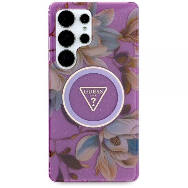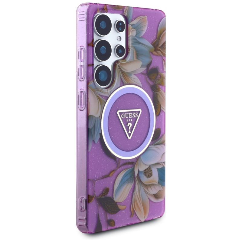 Husa Guess compatibila cu Samsung Galaxy S25 Ultra, Glitter Flowers Triangle Buttons MagSafe, Mov