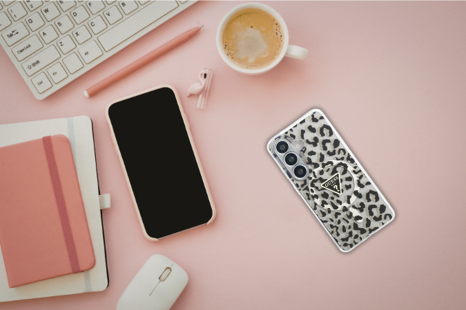În partea centrală a carcasei se află logo-ul Guess, care subliniază subtil prestigiul acestei carcase.
