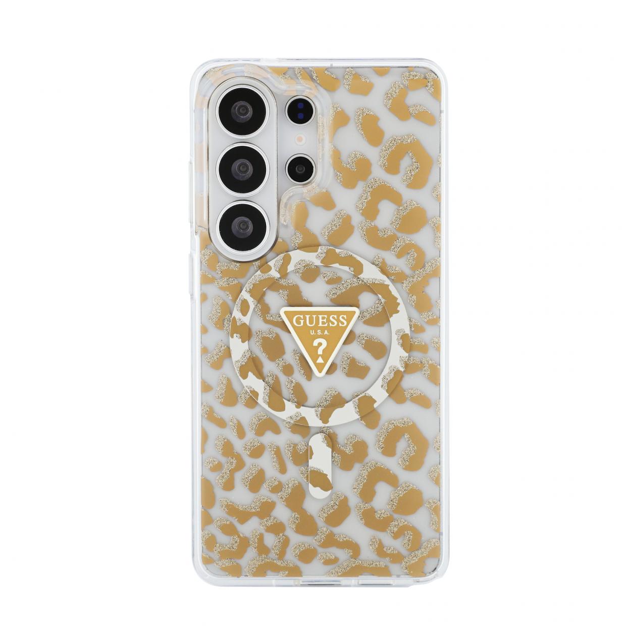 Ekskluzywne etui ochronne od renomowanej marki Guess to połączenie elegancji i stylu na najwyższym poziomie. Etui wykonano z wysokiej jakości poliwęglanu oraz poliuretanu. Powierzchnię zdobi zwierzęcy wzór, przypominający cętki oraz złoty pierścień MagSafe.