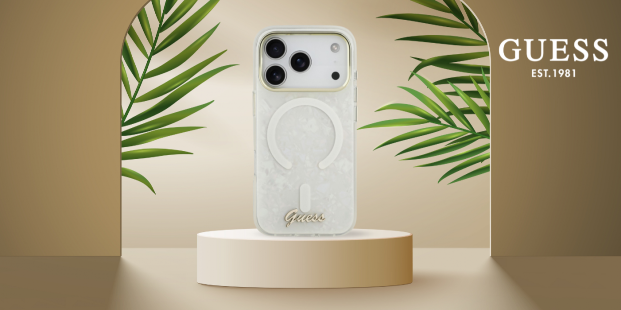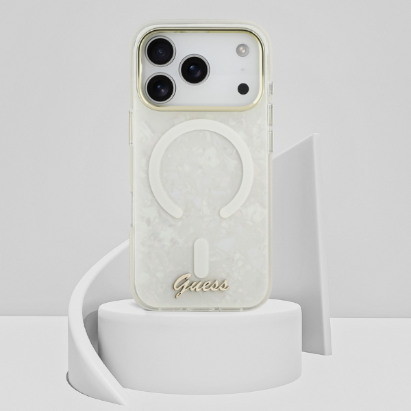 Această carcasă de protecție exclusivă de la renumita Guess este o combinație de eleganță și stil la cel mai înalt nivel. Carcasa este fabricată din policarbonat și poliuretan de înaltă calitate. Suprafața este împodobită cu un model de scoică, adăugând un caracter unic carcasei. Partea centrală a carcasei dispune de un inel MagSafe și logo-ul Guess, subliniind subtil prestigiul carcasei.