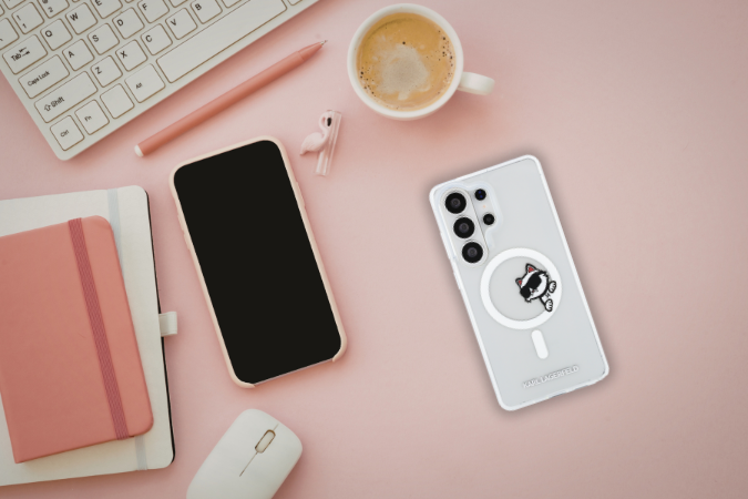 Partea din spate este împodobită cu imaginea pisicii Choupette, care se uită din spatele inelului MagSafe.