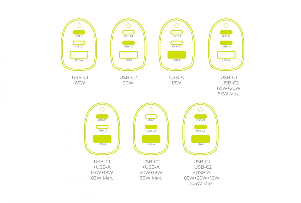Ieșire USB-C1+USB-C2+USB-A: 65W + 20W + 18W, PD+PD+QC (103W Max)