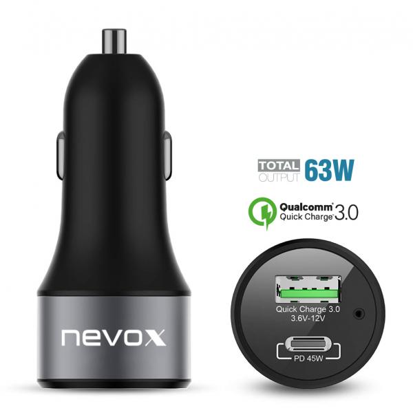 Incarcator auto NEVOX Qualcomm Quick Charge, 1x USB-C, 1x USB-A, 45W, 3A, Negru