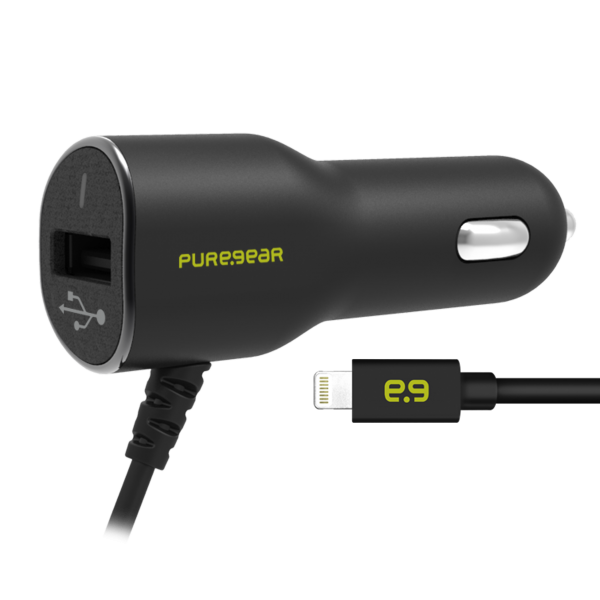 Încărcătorul auto PureGear dispune de un cablu Lightning integrat și un port USB universal suplimentar. Puterea totală de 17 W și curentul de 3,4 A sunt distribuite astfel: 2,4 A pentru Lightning și 1,0 A pentru portul USB.