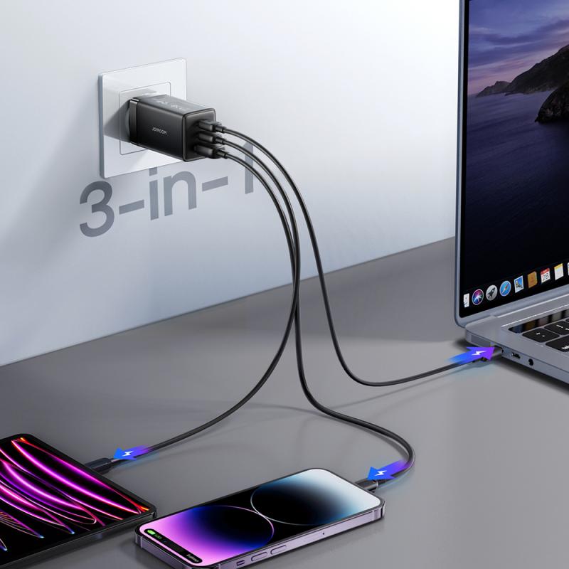 Joyroom JR-TG10 este un încărcător de perete puternic, de 65W, bazat pe tehnologia GaN, care permite încărcarea rapidă și simultană a până la trei dispozitive. Echipat cu două porturi USB-C și unul USB-A, este potrivit pentru laptopuri, smartphone-uri și tablete, oferind alimentare stabilă și eficientă. Tehnologia GaN reduce încălzirea și dimensiunea dispozitivului, iar cablul USB-C inclus (100W) crește confortul în utilizare. Este o soluție completă ce combină puterea mare, designul compact și versatilitatea.