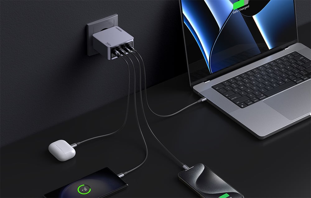 Nu pierde timp prețios așteptând ca dispozitivele tale să se încarce. Încărcătorul Ugreen oferă un port USB-A și trei porturi USB-C, ceea ce permite conectarea simultană a până la patru dispozitive. În plus, suportă protocoale de încărcare rapidă, inclusiv PD3.1, QC4.0, PPS și AFC. Astfel, iPhone 15 poate recupera 60% din energie în doar 30 de minute, iar Samsung S23 Ultra chiar 68% în același timp. Mai mult, MacBook Pro 16 poate fi încărcat cu o putere de 140 W, trebuie doar să ai un cablu USB-C corespunzător.
