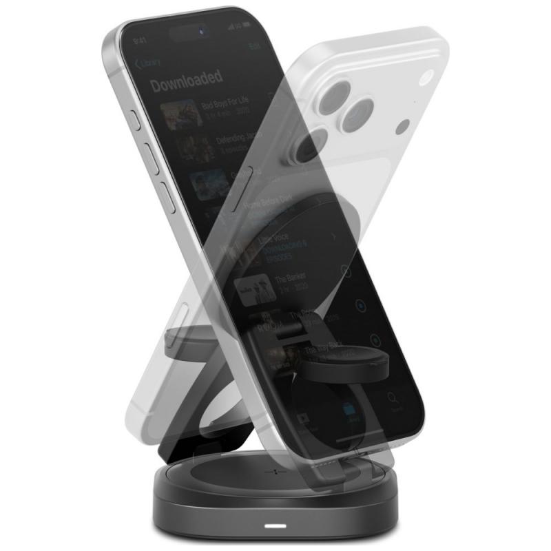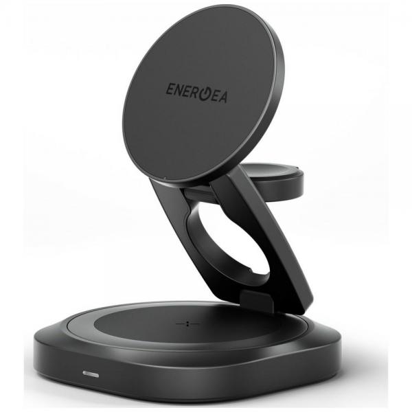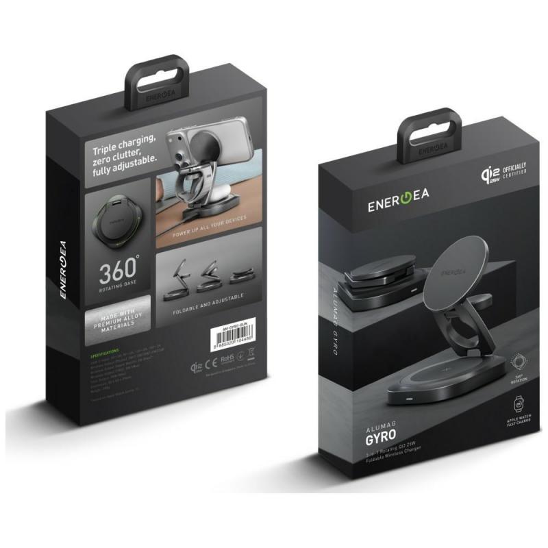 Incarcator Wireless 3 in 1 Energea Alumag GYRO 360 cu MagSafe, Pliabil, Incarcare Wireless 25W, Alimentare USB-C, Gunmetal