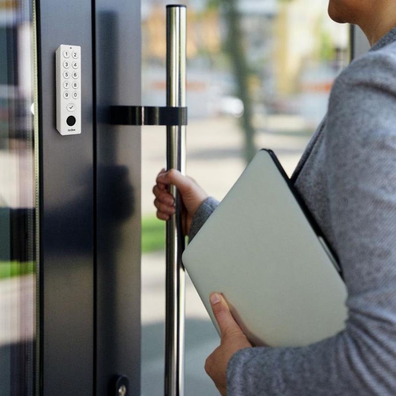 Keypad-ul are LED și buzzer pentru semnalizarea evenimentelor și este disponibil în două culori mate: negru și alb. Formele geometrice și butoanele discrete îl fac o completare subtilă, dar impresionantă, a ușii tale.