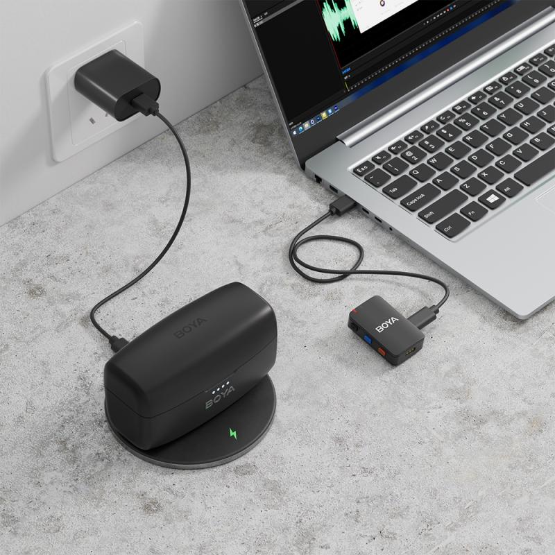 Kit microfon BOYA BOYAMIC 2-02, 2 TX + 1 RX USB-C, Noise Cancelling, Carcasa incarcare, Autonomie 9h, Negru