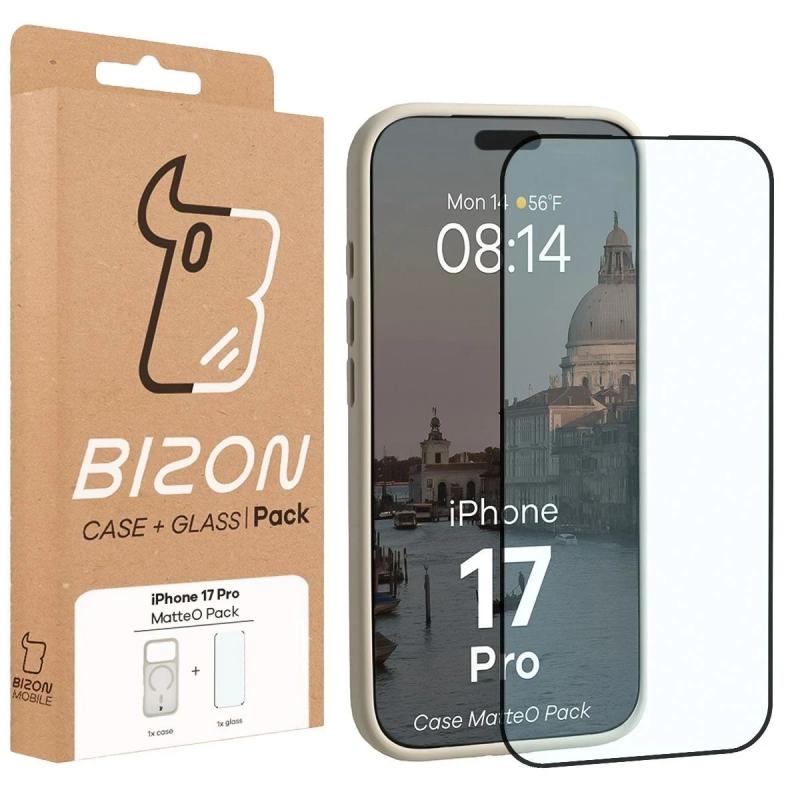 Kit protectie 2 in 1 BizonMobile, Carcasa Bizon MatteO si Folie sticla securizata Bizon Glass Edge, compatibil cu iPhone 17 Pro, Bej