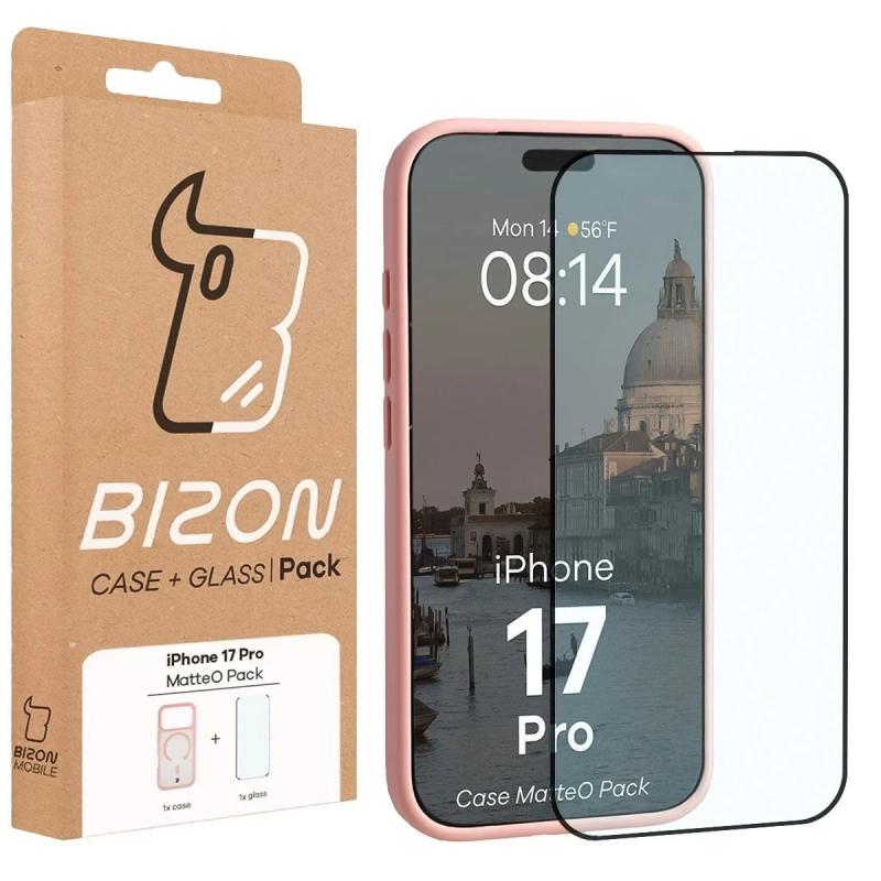 Kit protectie 2 in 1 BizonMobile, Carcasa Bizon MatteO si Folie sticla securizata Bizon Glass Edge, compatibil cu iPhone 17 Pro, Roz