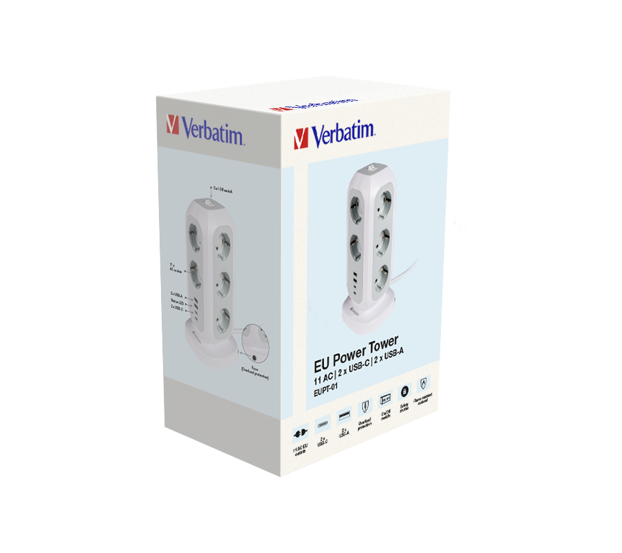 Turn de alimentare european 15 în 1. 11 prize AC UE, 2 x porturi USB-C + 2 x porturi USB-A. Design de turn care economisește spațiu. Comutator de pornire/oprire în partea de sus a turnului. Capace de siguranță pentru copii. Protecție împotriva suprasarcinii cu oprire automată a alimentării. Garanti de 2 ani de la Verbatim pentru durata de viață a produsului.