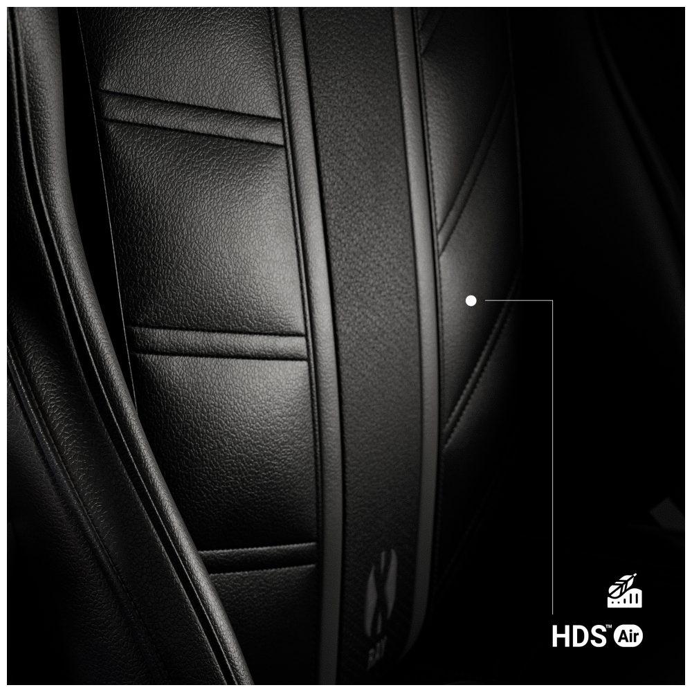 Tapițeria este realizată din eco-piele HDS™ de înaltă calitate, cu material perforat HDS™ Air în zona centrală pentru a îmbunătăți circulația aerului și a spori confortul. În plus, scaunul este echipat cu o pernă lombară și un suport pentru cap din spumă cu memorie, care împreună cu tehnologia ProSpine Support™ susțin coloana vertebrală și reduc oboseala chiar și în timpul șederii prelungite.