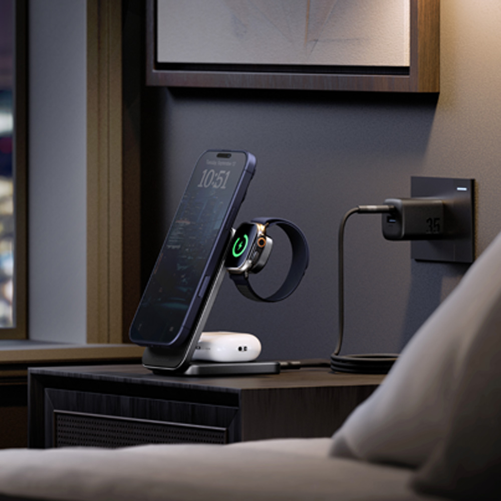 Stația suportă încărcarea simultană a trei dispozitive - un smartphone compatibil MagSafe, un Apple Watch (sau alte ceasuri compatibile Qi) și căști TWS cu carcase de încărcare wireless. Cu livrare de putere Qi2 de 25 W, obțineți încărcare wireless rapidă și stabilă, combinată cu curățenie și estetică - fără cabluri încurcate, doar o bază de încărcare pentru tot.