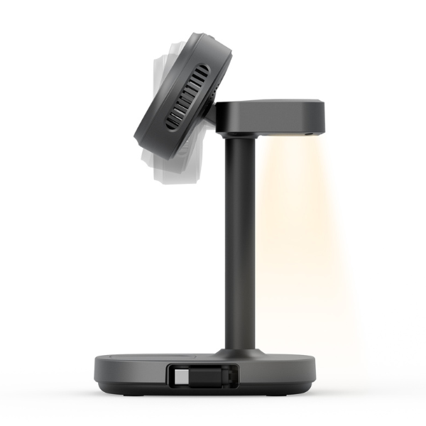 Designul vertical economisește spațiu pe birou sau noptieră, în timp ce cablul USB-C retractabil integrat cu o lungime de 70 cm asigură ordine și depozitare convenabilă. Stația dispune, de asemenea, de o iluminare LED blândă cu control tactil, facilitând utilizarea pe timp de noapte sau la locul de muncă.