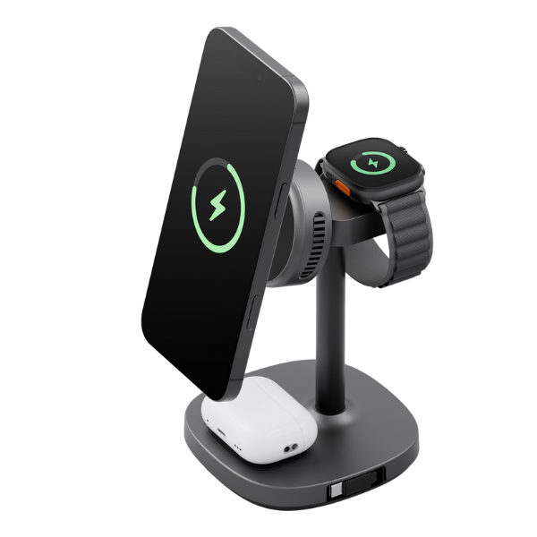 Stația oferă încărcare wireless rapidă de până la 15 W pentru smartphone-uri, 3 W pentru Apple Watch și 5 W pentru căști. Cu certificare Qi2 și aliniere magnetică precisă MagSafe, dispozitivele tale rămân atașate în siguranță în timpul încărcării. Sistemul activ de răcire cu o placă de disipare a căldurii integrată și un ventilator menține o temperatură optimă, sporind siguranța și prelungind durata de viață a bateriei.