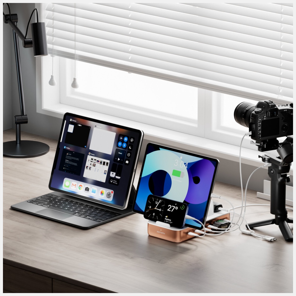The 4smarts Team 100W Charging Station with cable set in an elegant copper color is a modern and highly practical solution for charging multiple devices at the same time at home, in the office, or in a coworking space. Designed for teams and families, it allows you to conveniently and safely charge smartphones, tablets, laptops, headphones, and other electronic accessories in one place, eliminating cable clutter and occupied sockets.