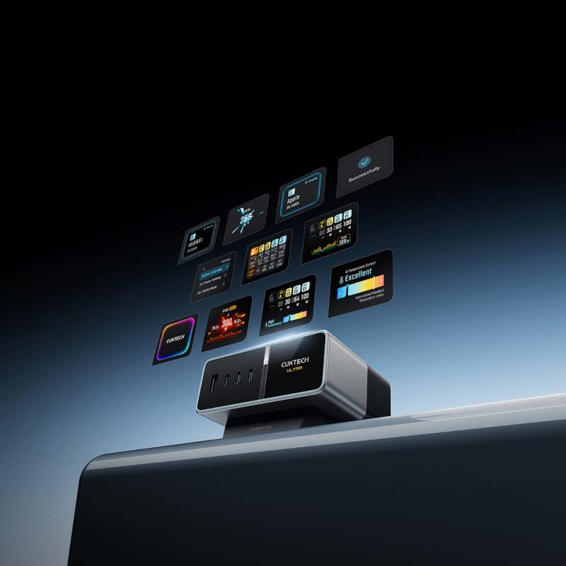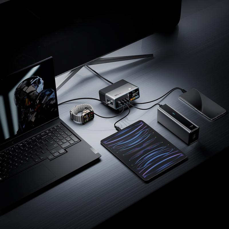 Stația de încărcare Cuktech TA3005U de 300W este o soluție avansată de tip desktop care combină puterea ridicată, versatilitatea și organizarea eficientă a spațiului de lucru. Cu o putere totală de până la 300W și un port DC dedicat, poate alimenta laptopuri de gaming și echipamente profesionale, în timp ce porturile USB-C și USB-A permit încărcarea simultană a mai multor dispozitive mobile. Ecranul IPS integrat oferă control complet asupra parametrilor de încărcare în timp real, iar tehnologia GaN contribuie la eficiență și stabilitate. Designul compact înlocuiește mai multe încărcătoare, simplificând organizarea spațiului și crescând confortul utilizării zilnice.