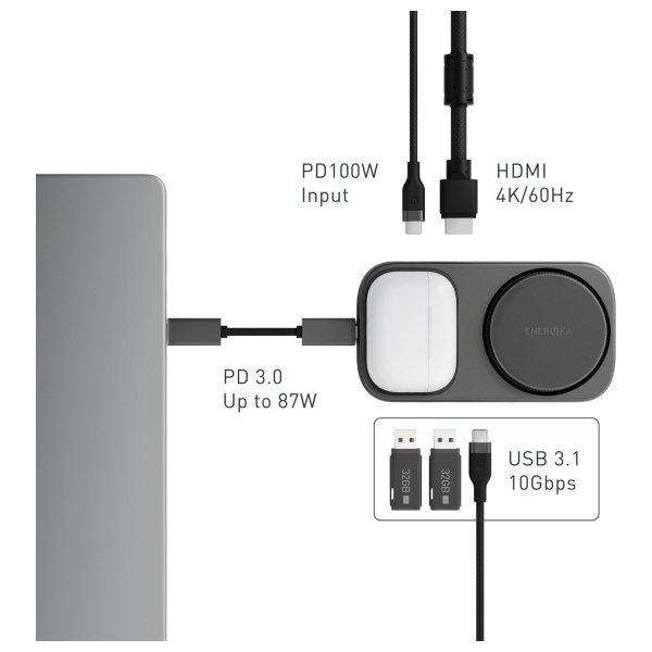 Statie de incarcare 7 in 1 Energea WiDock Plus, PD 100W, Incarcare Wireless 15W, 1x USB-C, 2x USB-A, 1x HDMI 4K / 60Hz, Gri