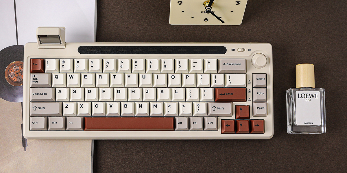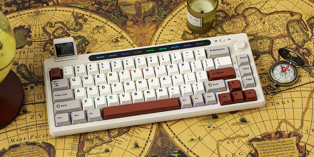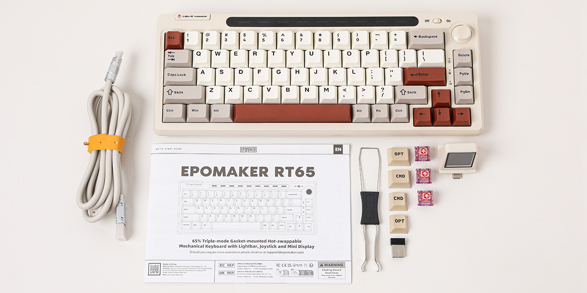 Tastatura EPOMAKER RT65 aduce un nou nivel de personalizare și comoditate în tastarea zilnică. Dispune de un mini-ecran detașabil care afișează informații utile precum data, ora, starea bateriei și chiar GIF-uri animate. Ecranul poate fi îndepărtat cu ușurință pentru a dezvălui un port ascuns pentru receptorul wireless de 2.4GHz. În loc de un buton tradițional, RT65 oferă un joystick inovator pentru controlul volumului cu mișcări simple sus-jos, iar un singur click oprește sunetul. Puteți chiar transforma joystick-ul într-un mouse prin Fn + joystick.