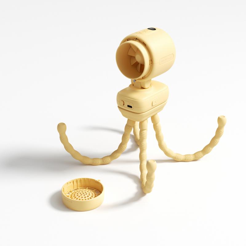 Trepiedul flexibil permite atașarea rapidă și sigură pe diverse suprafețe, ajustând poziția ventilatorului în funcție de nevoi.
