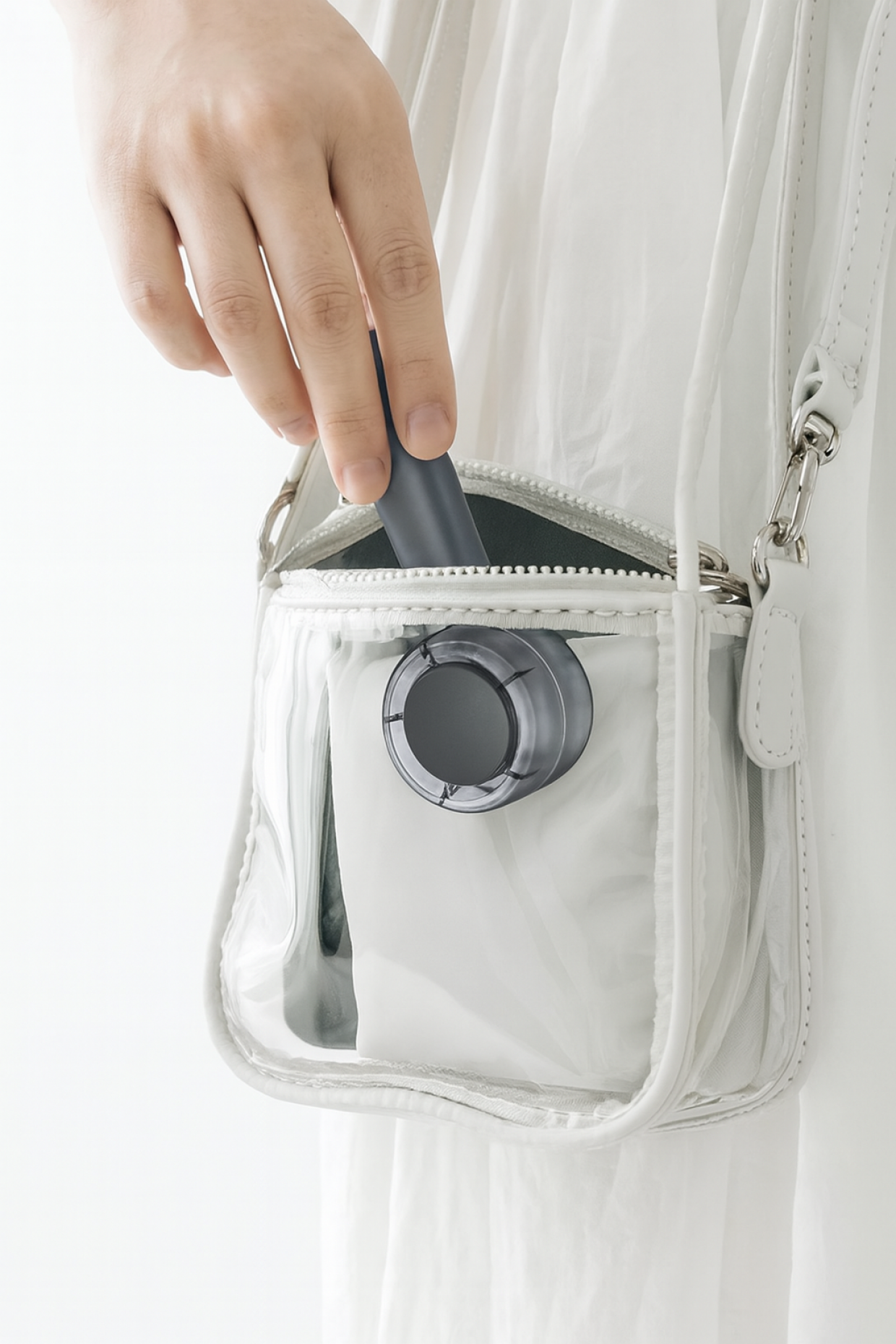 Ventilatorul are un design modern, transparent, care îi conferă un caracter unic și asigură că se integrează perfect atât în împrejurimile casual, cât și în cele mai elegante. Designul său ușor și compact, cu dimensiuni de 167 × 60 × 50 mm și o greutate de aproximativ 150 g, îl face extrem de portabil – încape într-o geantă de mână, rucsac sau chiar un buzunar mai mare, astfel încât să îl puteți avea mereu cu dumneavoastră. Este o soluție ideală pentru călătorii, vacanțe, plimbări sau naveta zilnică.