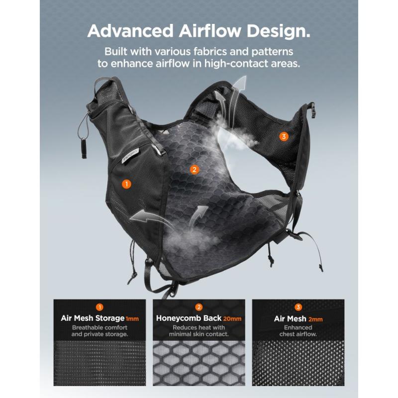 Sistemul de ventilație pe zone, adaptat fiecărei părți a vestei, asigură un flux optim de aer: spatele din plasă tip „fagure de miere” reduce suprafața de contact cu pielea și limitează încălzirea, plasa de pe piept îmbunătățește circulația aerului, iar plasa din buzunarul frontal menține forma și acoperă discret conținutul.