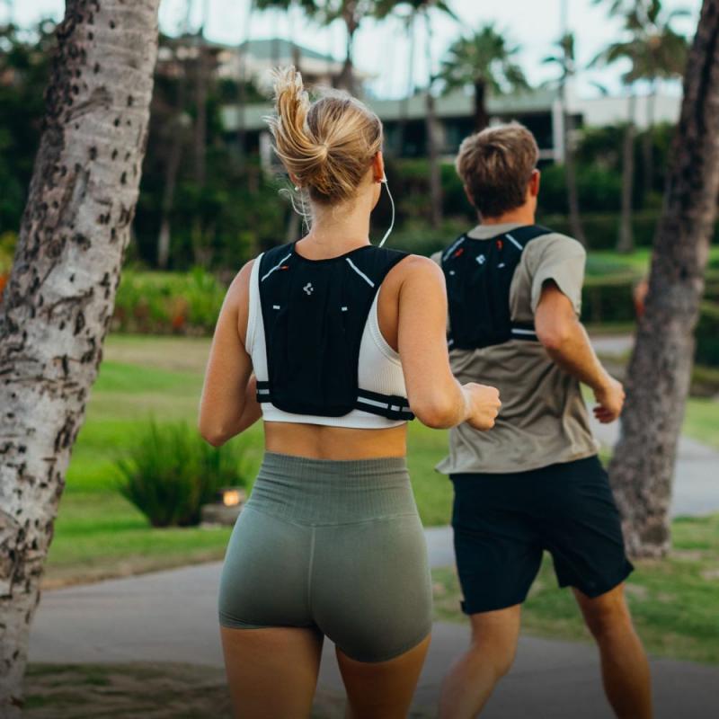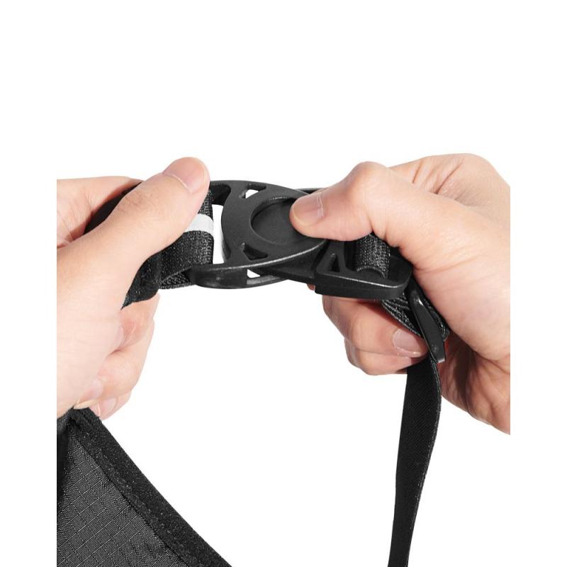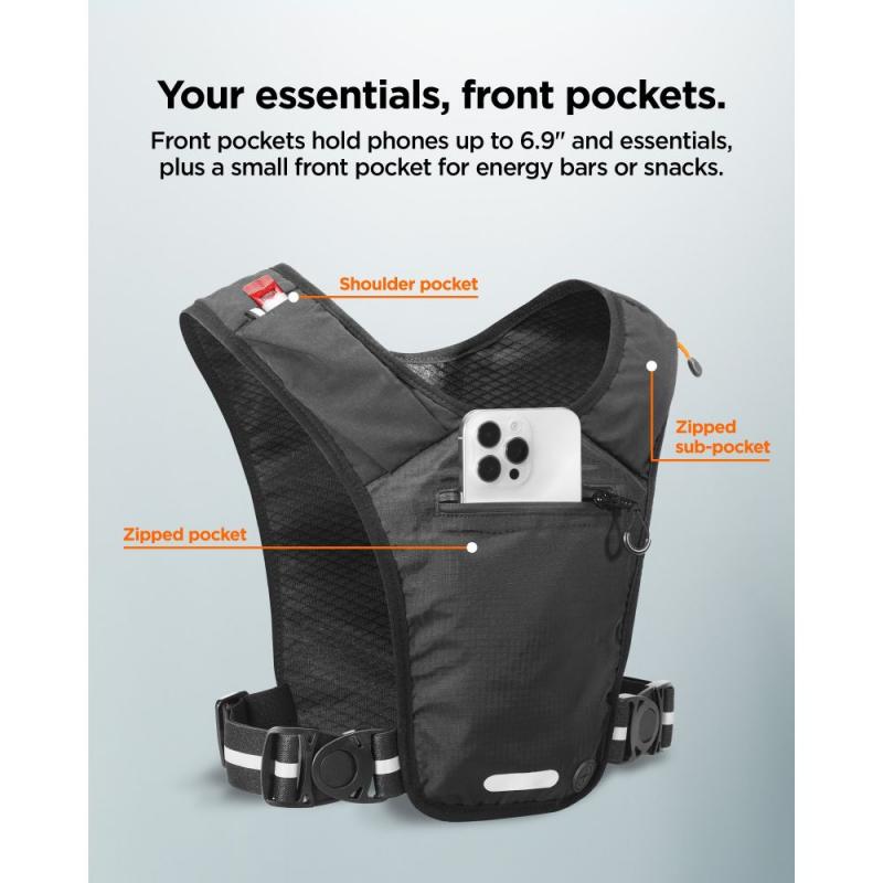 Buzunarul frontal poate găzdui smartphone-uri de până la 6,9", iar cel din spate – prevăzut cu clemă pentru chei – depozitează în siguranță portofelul, cheile și gelurile energetice, fără riscul de a cădea sau de a sări în timpul alergării. Un buzunar suplimentar pe umăr permite accesul rapid la batoane energetice sau accesorii mici, fără a opri antrenamentul.